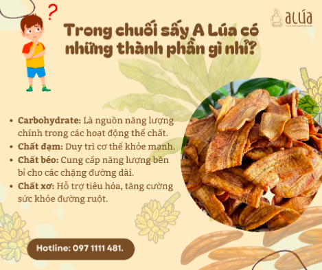 Chuối sấy mộc A Lúa còn là nguồn dinh dưỡng dồi dào. Với lượng carbohydrate, chất xơ, chất béo, chuối giúp bổ sung năng lượng nhanh chóng, hỗ trợ hệ tiêu hóa và tăng cường sức khỏe. Đặc biệt, chuối sấy mộc không chứa chất bảo quản, đảm bảo an toàn cho mọi lứa tuổi, từ trẻ em, học sinh đến dân văn phòng bận rộn.